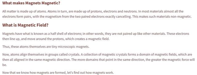 磁性的產生與原子內部的電子有關,一般物質具有成對的電子,顯示的磁性抵銷。而有些物質電子未配對,只有half shell of electrons, 這此電子自旋可以產生磁場,這些原子可以稱為小磁體。小磁體成一定規(guī)律排列構成晶體,晶體的定向排列,構成了磁場。微觀上的小磁體方向一致時,在宏觀上就表現(xiàn)為磁性。